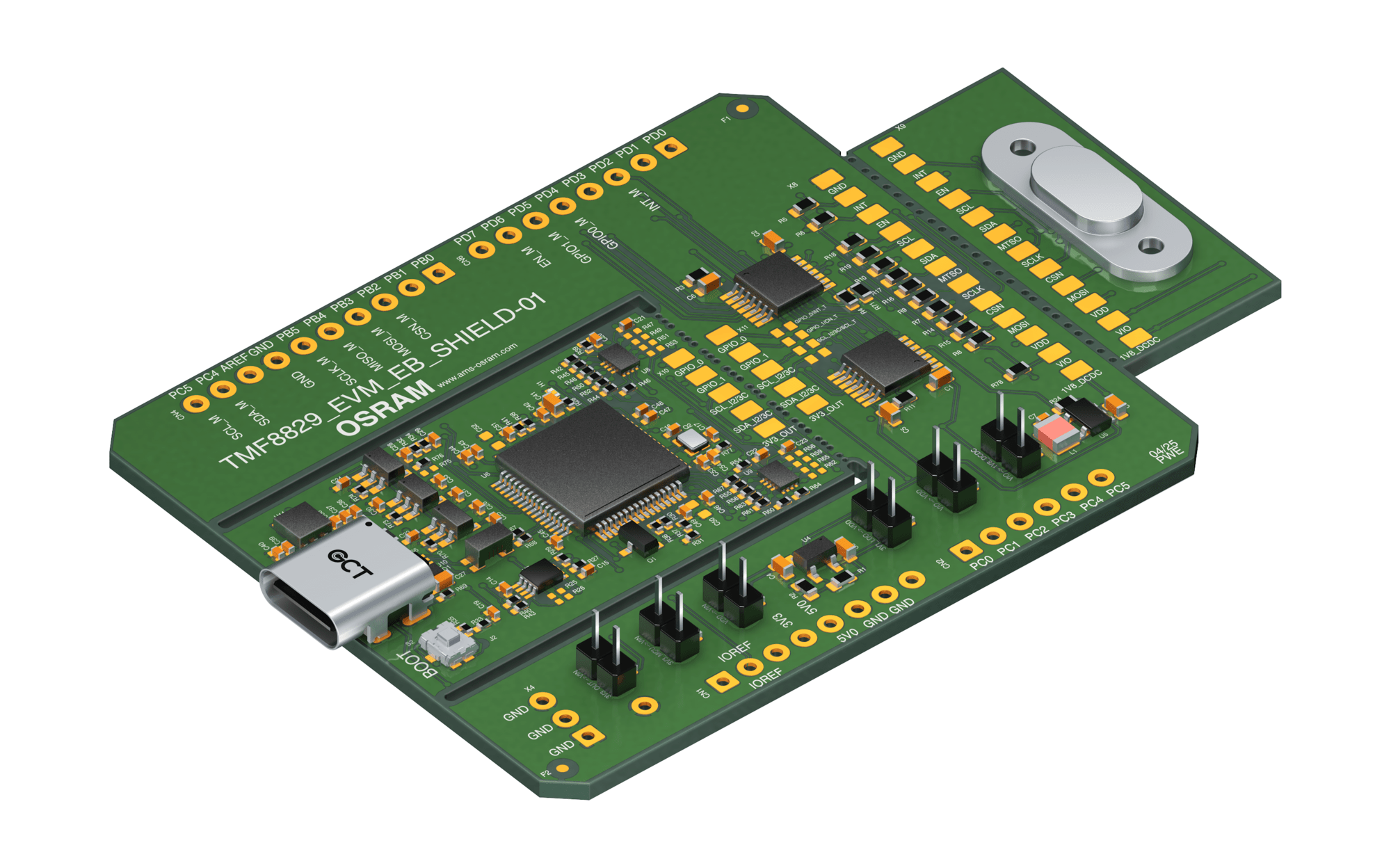 Product status: Pre-Production The TMF8829 MCU Shield board is designed to fit the Arduino UNO µC development board format. This board features a small breakaway section which includes the TMF8829 device, the board also features a USB interface to allow direct connection to the evaluation GUI.